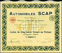 S.C.A.P. (Société de Construction Automobile Parisienne) was a French manufacturer of cars and proprietary engines, existing between 1912 and 1929.