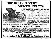 The company, based in Amesbury, Massachusetts, originally manufactured car bodies. Amesbury was a major center of car body manufacturers prior to the Great Depression. In 1907, S.R. Bailey began the production of automobiles. The brand name was Bailey, sometimes with the addition of Electric. 1916 was the last year of production, when the enterprise went into bankruptcy. Assets were purchased by Biddle and Smart, manufacturer of automobile bodies, in 1917.[1]