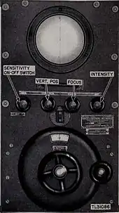The oscilloscope (A-scope) display employed a five-inch diameter 5BP4 cathode ray tube, the same type used in the first commercial RCA television set, the TRK-5, introduced in 1939. The sweep was normally generated from an internal 621 Hz oscillator that also drove the keyer, but an external source could be used. The sweep signal passed through a calibrated phase shifter controlled by a large hand wheel on the front panel. The delay between the transmitted and received pulses could be measured accurately by placing the transmit pulse under a hairline on the screen and then adjusting the hand wheel so that the received pulse was under the line.