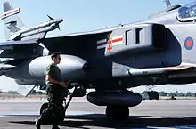 Following the success of the GR1B/T2B upgrade, the RAF launched a plan to upgrade its Jaguar fleet to a common standard, incorporating improvements introduced to some aircraft during the Gulf War, together with adding the ability to use TIALD and new reconnaissance pods. The upgrade came in two parts; the interim GR3 (Jaguar 96) upgrade added a new HUD, a new hand controller and stick top, integrated GPS and TERPROM Terrain Referenced Navigation. It was delivered in two standards, for recce and TIALD.[46][49] The further upgraded Jaguar GR3A (also known as Jaguar 97) introduced fleet-wide compatibility with TIALD and the new EO GP1 (JRP) digital reconnaissance pod, a helmet mounted sight, improved cockpit displays, a datalink, and improved night vision goggles compatibility.[50] All GR3As were subsequently re-engined with the new Adour 106 turbofan.[41] The RAF's Jaguar 97s were intended to be wired for the carriage of ASRAAMs on the overwing launchers, but clearance of this weapon was never completed because of funding cuts.[86][87]