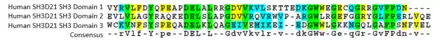 SH3D21 contains three SH3 domains.[7][12][13] These domains are located near the N-terminus of the protein. In humans, these SH3 domains have a common amino acid sequence Asp-Glu-Leu. This sequence motif is also conserved in other species. SH3D21 has been found to interact with Adenylate Kinase 2, Artemin, and Importin 13.[5] The human protein has two isoforms and no paralogs.[6] The second isoform is 645 amino acids long and is identical to the first isoform, except it is missing the first 111 amino acids.[14] Due to this, the second isoform is missing the first, and half of the second, N-terminal SH3 domain.[14] Secondary structure analysis of SH3D21 indicates a long alpha helical structure near the C-terminus.[15][16] The purpose of this structure is unknown. SH3D21 is predicted to have many phosphorylation sites and multiple sumoylation sites throughout the entirety of the protein.[17][18]