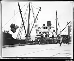 Upon her arrival at Sydney in 1910, Canonbar was docked, before commencing trade between Sydney and the Clarence and Macleay Rivers, for her first owners the North Coast Steam Navigation Company, of Sydney.[3] She also went to the Richmond River.[5] She was one of fourteen new NCSN Co. ships delivered, between 1904 and 1913, with names ending with 'bar'; the others were Noorebar (1904), Yugulibar (1907), Tintenbar (1908), Minimbar (1909),[6] Burringbar (1910),[7] Maianbar (1910), Coolebar (1911), Wollongbar (1911, a passenger ship), Gunbar (1912),[6] Coombar (1912),[8] Pulganbar (1912), Tambar (1912) and Poonbar (1913).[6]