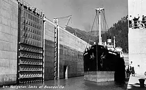 In 1938, the world′s largest single-lift lock was opened at the Bonneville Dam on the Columbia River.[4] As part of the opening ceremonies of the lock, Captain Arthur Riggs, a veteran upper Columbia river pilot, took Charles L. Wheeler Jr. – which was operated by McCormick Steamship Company and loaded with sugar, building materials, beer, hardware, automobiles, and general freight – upstream from Portland, transited the Bonneville Locks and continued on to the historic upper river steamboat port of The Dalles, Oregon.[5] She was the first ship to transit the lock at Bonneville Dam[6] and the first ocean-going merchant ship to transit the Columbia River all the way to The Dalles, located 200 miles (322 km) upstream from the Pacific Ocean.[7] Once unloaded at the Port of the Dalles, the ship was then loaded with lumber, wheat, flour, and other local products for the return voyage. Residents of The Dalles had hoped the trip would bring increased business to their port, but the trip was a one-time event,[5] and the Columbia River is dominated by barge traffic.[4]