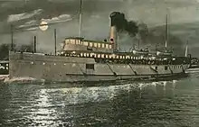 In the winter of 1927, Macassa was sold to the Owen Sound Transportation Company of Owen Sound, Ontario, and was rebuilt as a nightboat in Toronto.[5][18] Macassa was renamed Manasoo, a combination of Manitoulin Island and Sault Ste. Marie, Ontario.[19] Her promenade deck was covered with passenger cabins, and her pilothouse and masts were replaced.[5] After her rebuild, she was licensed to carry only 70 passengers.[20]