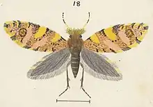 Dark ochraceous. Antennae with two black bands ; second band apical. Abdomen blackish. Fore wings with a few black speckles; costa with black points and with some gilded yellow marks ; of these the second forms a broad oblique streak, which extends to the disk and is much more conspicuous than the others ; fringe yellow; under side and hind wings blackish purple.[3]