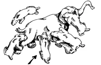 In 1985, American paleontologist William Akersten suggested the shearing bite.[53][54] This method of killing is similar to the style of killing seen in hyenas and canines today. A group of machairodonts captured and completely subdued a prey item, holding it still while one from the group bit into the abdominal cavity, pulled back and tore open the body.