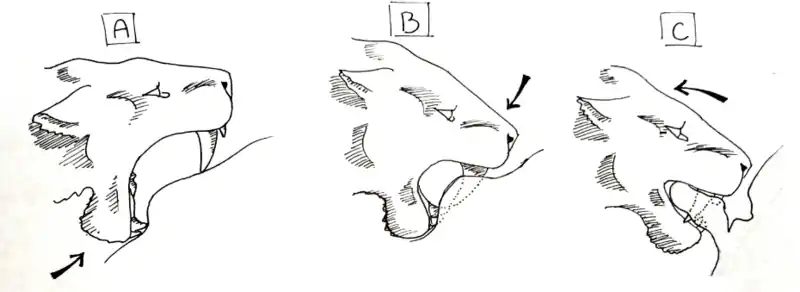 For this technique to work, a specific sequence of motions would have to be followed. First, the animal must be completely subdued, and the predatory machairodonts must be social, so that several individuals can hold the prey animal down. The individual preparing to deliver the killing bite would open its mouth at maximum gape, and with its mandible, press up on the skin of the belly. Creating a depression where the lower canines and incisors press into the skin, a slight fold is created in the skin above the lower teeth as the mandible is shoved upward. Next, the upper canines are pressed into the skin and the muscles of the neck are used to depress the head, so instead of pulling the jaw 'up', the skull is pressed 'down' . When the canines pierce the skin, they are lowered until the gape of the mouth is roughly 45°, where the mandible is pulled up in addition to the skull still being depressed. The small flanges on the anterior portion of the mandible of most machairodonts would be used to aid the depression of the skull. When the animal's mouth is closed, it holds a thick flap of skin between its jaws, behind its canines, and the animal uses the muscles of its lower back and forequarters to pull back, tearing the flap clear of the body. This large gash, once opened, leaves intestines uncovered and arteries and veins torn. The bleeding animal would die within minutes, and the shock of repeated bites, tearing innards from the body, could speed up the process.[55]