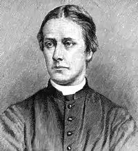 In 1852 he was admitted to Cambridge University, earning the degrees of Bachelor of Arts in 1857, then Master of Arts in 1860 from Clare College, Cambridge.[8] In September 1853 he informed Nathaniel Woodard of his desire to be ordained. He taught for only ten days at one of Woodard's boys' boarding schools in Sussex, Lancing College, but then moved to another, Hurstpierpoint College, where he stayed from 1857 to 1864.[9] While there he was responsible for several subjects, especially languages and science, and he also designed the ironwork of the bookcases in the boys' library, as well as painting the window jambs with scenes from the Canterbury Tales and The Faerie Queene.[10]