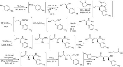 The large scale synthesis of Sacubritil begins with 4-bromo-1,1'-biphenyl, which is converted to its corresponding Grignard reagent; this is reacted directly with (S)-epichlorohydrin regioselectively at less-substituted site of the epoxide.[6][7]
