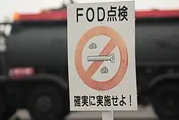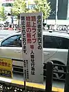 Japanese safety signage is notable for its clear visual differences from international norms, such as use of square 'no symbols', vertical formatting of sign text. Safety sign standards are regulated by Japanese Industrial Standards through standards JIS Z9101 (Workplace and public area safety signs) JIS Z 9103 (Safety sign colors) and JIS Z 9104 (Safety signs - General specifications). While design trends have been moving towards international norms of ISO and ANSI standards, differences are still present such as the use of symbols unique to the JIS standards, using colors differently from ISO standards[lower-alpha 4] and using a combination of Japanese kanji and English. In addition to typical safety sign standards, Japan introduced JIS Z 9098 in 2016 specifically addressing emergency management needs: informing people of areas susceptible to natural disasters, evacuation routes and safe shelters from disasters. The standard's more unique aspect is the usage of maps and diagrams to provide more detailed information about the area's hazards, shelters and evacuation routes.[8]