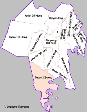 Saha-gu is divided into 8 legal dong, which all together comprise 16 administrative dong, as follows: