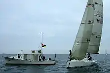 This kind of race is most commonly run over one or more laps of a triangular course marked by a number of buoys. The course starts from an imaginary line drawn from a 'committee boat' to the designated 'starting' buoy or 'pin'. A number of warning signals are given telling the crews exactly how long until the race starts. The aim of each crew is to cross the start line at full speed exactly as the race starts. A course generally involves tacking upwind to a 'windward' marker or buoy. Then bearing away onto a downwind leg to a second jibe marker. Next another jibe on a second downwind leg to the last mark which is called the 'downwind mark' (or 'leeward mark'). At this mark the boats turn into wind once again to tack to the finish line.