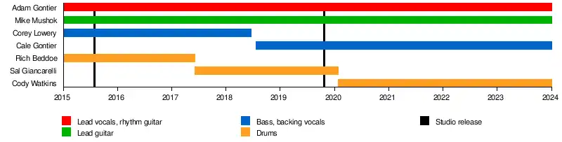 On June 5, 2017, drummer Rich Beddoe confirmed that he had left Saint Asonia on good terms to do other things.[17] On July 12, 2017, the band played their first show with Mike Mushok's former Staind bandmate Sal Giancarelli on drums. Lowery departed the band during the summer of 2018 to join Seether full-time and was replaced by Art of Dying bassist and Gontier's cousin Cale Gontier.[18]