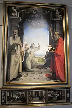 The first masterpiece of the artist's maturity, it was originally in the now-destroyed Olivetan monastery outside the Porta Tufi. It is dated on stylistic grounds. The predella was removed around the time of Della Valle before being recovered in the Padre Generale's apartments. The whole work was restored by the Florentine Gagliardi in 1830.[1]