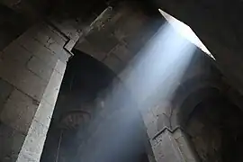 Saint Gayane Church is a three-nave domed basilica with an octagonal drum resting on four internal pillars that divide the interior of the church into three naves. The middle sections of the side naves are elevated slightly over the corner ones and roofed with vaults across the building, forming a transversal nave. At the eastern wall of the church's interior is a semicircular apse with a rectangular chamber at either side. Three portals lead into the interior of the building. The main portal enters through the arched portico, while two side entries are located at the north and south walls.