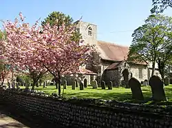 This small flint church stands on the coast road in the centre of the village of Trimingham. The main gateway into the churchyard is through a thatched lychgate[4] on church street. The roof is slate and tiles[2] with leadwork. The greater part of the church is built in the Perpendicular style[5] and has a rather short squat west bell tower[2] which was built around 1300 and has no parapet.[5] A prominent feature of the churches bell tower are the large solid stone dressed flint buttress[4] on the corners of the tower. The buttress to the north west corner has a bench mark[6] carved into the masonry at its base.