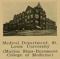 In 1903, the Marion Sims-Beaumont College of Medicine was incorporated into the university.[4] At this time, Marion Sims-Beaumont College was a medical school owned and operated by a group of St. Louis physicians. The college's decision to merge with the university was greatly influenced and reinforced by the recommendations of the Council on Medical Education and Hospitals of the American Medical Association, which insisted that all schools of medicine be affiliated with a university. Assured of financial support from the St. Louis civic leader Festus J. Wade, President Rogers successfully secured the needed funds for the purchase of the Marion Sims-Beaumont College.