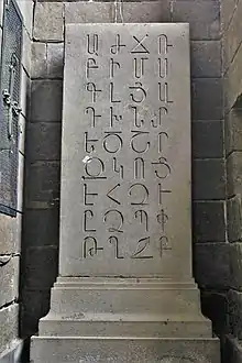 The church underwent extensive renovation in the 1960s, during the reign of Catholicos Vazgen I, through the financial support of Hayk and Torgom Ghazarosian brothers of Milan, Italy,[26][6][27] originally from Yerznka (Erzincan).[28] A monument depicting the original 36 letters of the Armenian alphabet, as created by Mashtots, in the erkatagir style, was erected near the entrance to the grave of Mashtots. It was designed by Baghdasar Arzoumanian.[26] The floor of the church was covered with basalt tiles.[22] A perimeter wall with a total length of 310 metres (1,020 ft) was built around the church in tuff.[22] A drinking fountain designed by Rafael Israelyan was erected at the church courtyard in 1964.[6]