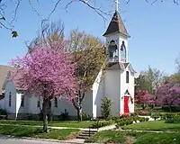 St. Paul's Episcopal Church is a historic Carpenter Gothic style Episcopal church building located on a triangular lot at 416 Southeast Grand Avenue at the corner of Fifth and Green streets in Lee's Summit, Missouri, United States. The parish was established in 1867. The original sanctuary and current building were designed by the Rev. Frederick B. Scheetz and completed in 1884. The building is a rare example of an extant wood framed Carpenter Gothic church in the state of Missouri. The interior walls and vaulted ceilings are covered with narrow strips of wood paneling set diagonally on the walls and horizontally on the ceiling. A trio of stained glass windows is set above the wooden altar in the apse at the north end of the transept. The church has received few if any alterations since it was built in 1884.[2]