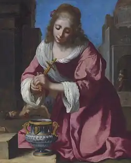 Saint Praxedis is an oil painting by Johannes Vermeer. This attribution has often been questioned.[1][2][3] In 2014 the auction house Christie's announced the results of new investigations which in their opinion demonstrated it conclusively to be a Vermeer.[4] In the 2023 Vermeer exhibition held by the Rijksmuseum, the museum conducted an investigation and concluded it is painted by Vermeer.[5] The painting is a copy of a work by Felice Ficherelli, and depicts the early Roman martyr, Saint Praxedis or Praxedes. It is one of Vermeer's earliest surviving works, dating from 1655.[1]