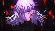 In Heaven's Feel it is revealed that Sakura underwent years of torture and sexual abuse by Shinji and her grandfather Zōken Matō that have left her psychologically scarred and emotionally dependent on Shirou. At the end of the previous Grail War, Zōken implanted a piece of the Grail into Sakura in an attempt to recreate it, turning her into the Black Grail, the counterpart to Einzbern's White Grail. This leads a Servant from the Third Holy Grail War Angra Mainyu (also known as Avenger) to manifest itself through Sakura as "The Shadow" while she is asleep. Consequently, Sakura takes on the form of the Shadow at night, which kills hundreds of people to gain energy.[15] As a result of the combined machinations of Zōken and magus priest Kirei Kotomine, she gradually sinks into depravity before embracing the Shadow to become the bloodthirsty Dark Sakura. Torn between her usual self and being fully consumed by her long-repressed feelings of rage and envy, Sakura initially intends to sacrifice herself in order to stop Angra Mainyu, but proceeds to seek vengeance upon the world by unleashing Angra Mainyu upon humanity after her biological sister Rin, from whom she was separated after being adopted into the Matou family, expresses her desire to kill her. She is stopped, however, when in their ensuing battle, Rin finds she cannot kill her sister and lets herself be stabbed before revealing to Sakura that she never stopped caring for her. Realizing her folly, Sakura regains control of her mind for long enough for Shirou to free her of the Shadow. In her route's Normal End, Sakura goes insane from Shirou's sacrifice during the Grail's destruction and lives alone in the Emiya household for the rest of her life, believing Shirou will return to her to take her to see the cherry blossoms. When Sakura dies, she sees Shirou waving to her in a final dream or afterlife.[16] In the True End, Sakura lives with Shirō and Rider in peace, realizing for the first time she is truly happy.[17]