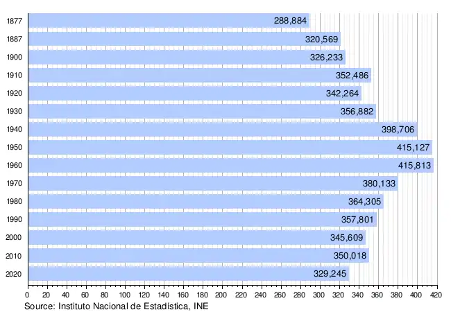 Salamanca (Spanish pronunciation: [salaˈmaŋka])[2] is a province of western Spain, in the western part of the autonomous community of Castile and León (Castilla y León). It is bordered by the provinces of Zamora, Valladolid, Ávila, and Cáceres, and on the west by Portugal. It has an area of 12,349 km² and in 2018 had a population of 331,473 people. It is divided into 362 municipalities, 11 comarcas, 32 mancomunidades and five judicial districts. Of the 362 municipalities,[3] more than half are villages with fewer than 300 people.
