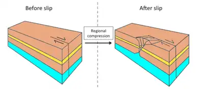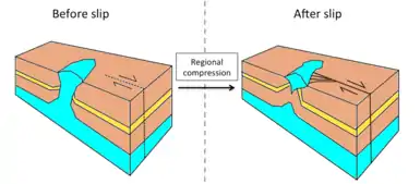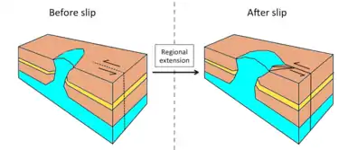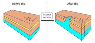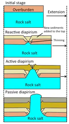 | 2 | Preexisting | Localized extension | Widening of diapir, diapir can fall if the rate of salt supply is not enough to support the weight of the overlying rock,[16] but will rise if there is sufficient salt supply to push up the overburden[1] | ![]() Left lateral shear, salt layer is marked in blue |