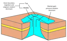 Pressure-solution involves dissolution of crystals, it becomes the main deformation mechanism when salt is wetted.[1] This process are usually observed at distal part of a salt glacier.[14]