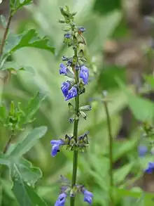 It is a perennial with shiny, dark-green leaves and clusters of indigo flowers. It can get up to heights of 2 feet tall. The fruit are nutlets. The bloom time is in the months of July, August, and September.[3] The flowers are small, semi-tubular, and are dark blue with a white throat. The green, thin stems hold the clusters of flowers above the foliage. The leaves are in an elongated triangular shape with pronounced veins.[4] The stems are square with creeping rootstocks. The leaves are glabrous on both sides, deltate-ovate in shape, and have small teeth. The flowers are in interrupted spikes or heads, the calyx is 2 lipped with small teeth. The two fruits are smooth.[5]