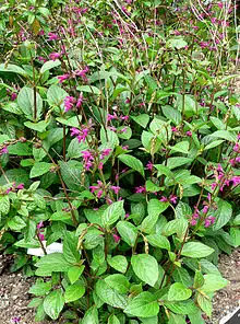 Chiapas sage grows about 1.5โ2 feet (0.46โ0.61 m) tall and wide, with several stems growing out of the rootstock. The 3-inch-long (76 mm) and 1.5-inch-wide (38 mm) elliptic-shaped leaves are ivy-green, glossy, and deeply veined, growing widely spaced along the stem. The flowers are bright fuchsia, with 3โ6 flowers growing in whorls, widely spaced along the inflorescence. The flower is 0.75 inches (19 mm) long and covered in hairs, with a 0.5-inch-long (13 mm) pea-green calyx.[1]
