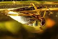The Salvinia effect describes the permanent stabilization of an air layer upon a hierarchically structured surface submerged in water. Based on biological models (e.g. the floating ferns Salvinia, backswimmer Notonecta), biomimetic Salvinia-surfaces are used as drag reducing coatings (up to 30% reduction were previously measured on the first prototypes.[1][2] When applied to a ship hull, the coating would allow the boat to float on an air-layer; reducing energy consumption and emissions. Such surfaces require an extremely water repellent super-hydrophobic surface and an elastic hairy structure in the millimeter range to entrap air while submerged. The Salvinia effect was discovered by the biologist and botanist Wilhelm Barthlott (University of Bonn) and his colleagues and has been investigated on several plants and animals since 2002. Publications and patents were published between 2006 and 2016.[3] The best biological models are the floating ferns (Salvinia) with highly sophisticated hierarchically structured hairy surfaces,[4] and the back swimmers (e.g.Notonecta) with a complex double structure of hairs (setae) and microvilli (microtrichia). Three of the ten known Salvinia species show a paradoxical chemical heterogeneity: hydrophilic hair tips, in addition to the super-hydrophobic plant surface, further stabilizing the air layer.[5]