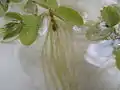 Salvinia natans has two nickel-sized leaves lying flat against the surface of the water, and a third submerged leaf which functions as a root. Flotation is made possible by pouches of air within the leaves. Cuticular papillae on the leaves' surface keep water from interfering with the leaves' functioning, and serve to protect them from decay. Spore cases form at the plant's base for reproduction.[3]