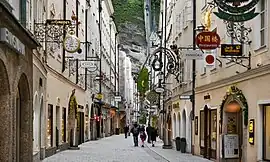 View of shoppers on Getreidegasse, which is one of the oldest streets in Salzburg