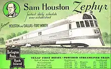 The Sam Houston Zephyr was a named passenger train operated by the Burlington-Rock Island Railroad, a subsidiary of both the Chicago, Burlington and Quincy Railroad and the Chicago, Rock Island and Pacific Railroad. It was the first streamlined passenger train in Texas.[1]