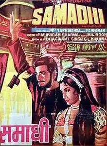 Samadhi is a 1972 Hindi film directed by Prakash Mehra. The film stars Dharmendra in double role as father and son, along with Asha Parekh and Jaya Bhaduri as their love interests. The music was composed by R. D. Burman. The memorable songs in the film include "Kaanta Laga", "Jab Tak Rahe" and "Jaan-E-Jaana". The film was remade in Telugu as Nindu Manishi (1978). The film became a huge success at the box office, collecting around 3.2 crore rupees.[2]
