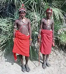 Men wear a cloth which is often pink or black and is wrapped around their waist in a manner similar to a Scottish kilt. They adorn themselves with necklaces, bracelets and anklets, like other sub tribes of the Maasai community. Members of the moran age grade (i.e. "warriors") typically wear their hair in long braids, which they shave off when they become elders. It may be colored using red ochre. Their bodies are sometimes decorated with ochre, as well. Women wear two pieces of blue or purple cloth, one piece wrapped around the waist, the second wrapped over the chest. Women keep their hair shaved and wear numerous necklaces and bracelets. In the past decade, traditional clothing styles have changed. Some men may wear the 1980s-90s style of red tartan cloth or they may wear a dark green/blue plaid cloth around their waists called 'kikoi', often with shorts underneath. Marani (Lmuran)[7] (warriors) wear a cloth that may be floral or pastel. Some women still wear two pieces of blue or red cloth, but it has become fashionable to wear cloths with animal or floral patterns in deep colors. Women may also often wear small tank tops with their cloths, and plaid skirts have also become common.[8]