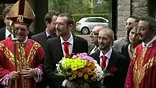 In 1999, the PS (French-speaking Social Democrats) and Ecolo (French-speaking Greens) also announced their support for the legalisation of same-sex marriage. At that point, the only remaining party in government that opposed same-sex marriage was the French-speaking liberal PRL (later merged into MR), mainly because it was opposed to adoption rights for same-sex couples. PRL agreed not to block same-sex marriage if adoption rights were excluded. As the first same-sex marriage in the Netherlands was performed on 1 April 2001, the Belgian Government, mostly under the lead of Minister of Health Magda Aelvoet (Agalev), began considering it as well.[9][10] On 22 June, the Council of Ministers formally approved opening marriage to same-sex couples.[11] In September, the largest opposition party, the Christian People's Party (CVP), held a party convention where they rebranded into Christian Democratic & Flemish (CD&V), with a renewed party platform, including the aim of legalising same-sex marriage, put forward by their youth wing.