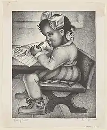 In 1936, Brown was one of four African American artists in the New Horizons in American Art exhibit sponsored by the Museum of Modern Art and the FAP.[31] Brown’s Mrs. Simmons was prominently displayed and drew the most attention.[31] He had two other works in the exhibit: Child Prodigy and The Writing Lesson.[31]