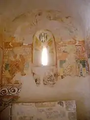 The murals in the vaulting of the church are almost all gone. There are a few fragments left that contained scenes from the life of the Christ and the Virgin: The Adoration of the Magi, Adoration of the Shepherds, Circumcision, The flight into Egypt, and probably the Annunciation and Presentation in the Temple.