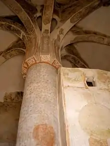 The hermitage housed many fine Romanesque frescoes from about 1125; most of these have been removed, but some have remained. Two sections, transferred to canvas, are now in the Indianapolis Museum of Art, showing the Entry of Christ into Jerusalem and the Wedding at Cana.[7] Other sections, including The Healing of the Blind Man and the Raising of Lazarus and The Temptation of Christ are in the Metropolitan Museum of Art in New York,[8] and in the Prado. The paintings are considered the work of three anonymous local artists. All decorative motifs on arches and vaults, as well as the large biblical scenes and the paintings on the apse, are attributed to the Master of Maderuelos, or First Master of Casillas. The hunting scenes of the lower areas, which are the most original, are attributed to the Master of San Baudelio. A third master of more modest proficiency is considered the author of the paintings inside the choir. [The paintings were done by the Catalan Master of Tahull (Taüll in Catalan), whose best known works are in Sant Climent de Taüll and the Museu Nacional d'Art de Catalunya in Barcelona,[9] with two other painters.]? The scenes of the Life of Christ are unusual in Spanish painting at this period; these are in American museums, while smaller elements including scenes of hunting and falconry and decorative copies of textiles are in Madrid as well as New York.[10] The frescoes include that of a camel and of a war elephant, which were inspired by Muslim motifs.[1]