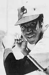 That same year, the Padres returned to wearing traditional buttoned uniforms designed by Sidjakov Berman & Gomez.[12] The home uniforms featured the script "Padres" in front while the road uniforms had the "SD" emblazoned on the left chest. Brown letters with orange trim and brown pinstripes adorned both uniforms. The "RAK" initials remained until 1986. An all-brown cap with the orange "SD" was used with the uniform.