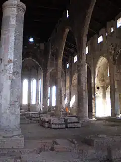 The nave had three aisles, separated by columns, with a higher central one.[2] The cupola pinnacles were painted by Michele Anselmi. The apse has an aged fresco depicting Christ Pantocrator attributed to Bernardino Grossi and his son in law Jacopo Loschi.