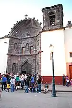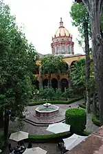 One hall of the old convent is dedicated to a mural by David Alfaro Siqueiros along with students from the art school, but it was never finished.[35] The complex has a museum, an auditorium, two art galleries and the Las Musas restaurant.[31][36] Next to the cultural center is the Inmaculada Concepcion Church, locally known as Las Monjas (English: The Nuns). It was originally constructed as part of the convent. The church was constructed between 1755 and 1842 with an elegant cupola added by Zeferino Gutierrez in 1891, inspired by the Les Invalides in Paris.[36] The cupola is octagonal and decorated with Corinthian columns in the lower area and the upper area has a window with a balustrade and statues of saints. Topping the cupola is a lantern window with a statue depicting the Immaculate Conception.[6] Inside, there are paintings by Juan Rodriguez Juarez.[35]