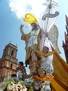 Holy Week begins with an exhibition of altars dedicated to the Virgin of Sorrows and end with the Procession of Silence.[38] Prior to the Procession of Silence, there is a reenactment of the judgment of Jesus by Pontius Pilate, on one side of the San Miguel Parish. Then the procession begins, which represents the fourteen scenes of the Passion before his crucifixion. Many of the townspeople participate in the event, with children dressed as angels and adults in period clothing carrying statues of Jesus. The procession winds its way along the main streets of the historic center completely in silence.[47] Another large religious celebration is the feast of Nuestro Señor de la Columna.[48]