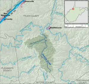 Sancho Creek is a tributary of Middle Island Creek, 9.6 miles (15.4 km) long,[3] in northwestern West Virginia in the United States. Via Middle Island Creek and the Ohio River, it is part of the watershed of the Mississippi River, draining an area of 22.2 square miles (57 km2)[4] in a rural region on the unglaciated portion of the Allegheny Plateau.