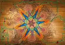 Other contemporary artists who work with sand include Andrew van der Merwe, based in Cape Town, who carves calligraphic imagery into the sand on beaches;[24] Andres Amador, an American artist who rakes designs into beaches;[25] Ahmad Nadalian, an Iranian artist who uses natural ground pigments to paint with sand;[26] and Motoi Yamamoto, who makes paintings reflecting typhoons and natural phenomena using salt.[27][28]