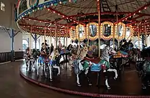 The Santa Monica Looff Hippodrome is located on the Newcomb Pier adjacent to the Santa Monica Pier in Santa Monica, California. It was designed and built in 1916 by Charles I. D. Looff and his son Arthur to hold a Looff Carousel. Looff's carousel was housed at the Hippodrome until it was sold in 1939. It was replaced by Philadelphia Toboggan Company Carousel #62, which was moved from the Ocean Park Pier. The building remains a rare example of structures that used to be on the amusement pier, and scenes were filmed therein for the 1973 award-winning film, The Sting.[4] Since 1977, the carousel has been owned by the city,[5] and was restored from 1977 through 1981.[6] It was declared a National Historic Landmark in 1987.[3][6]
