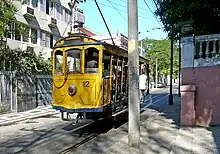 The Santa Teresa Tram, or Tramway (Portuguese: Bonde de Santa Teresa, IPA: [bõˈdʒi dʒi ˈsɐ̃tɐ teˈɾezɐ]), is a historic tram line in Rio de Janeiro, Brazil. It connects the city's centre with the primarily residential, inner-city neighbourhood of Santa Teresa, in the hills immediately southwest of downtown. It is mainly maintained as a tourist attraction and is nowadays considered a heritage tramway system, having been designated a national historic monument in 1985.[1] The line has a very unusual gauge: 1,100 mm (3 ft 7+5⁄16 in). The main line is 6.0 kilometres (3.7 miles) long.[2]