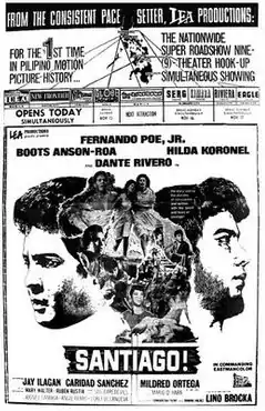 Santiago! is a 1970 Philippine war drama and action film directed by Lino Brocka and starring Fernando Poe Jr. and Dante Rivero.[1] Set during World War II, the film depicts a weary guerilla, Gonzalo, who withdraws from the battlefield.[2] The film is the second directorial assignment of Brocka following his debut offering "Wanted: Perfect Mother". The film is also the first and only collaboration of Brocka and Poe, and features a rare scene featuring FPJ shedding a tear.[3][4] The film is likewise notable for being the vehicle for Hilda Koronel's acting debut which also brought her her first acting award.[5]