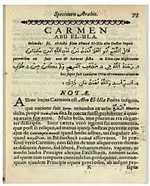 The Dutch Arabist Erpenius and his pupil Jacobus Golius collected manuscripts, and Golius purchased a copy of Dhou as-Saqt, now held in the collections of the University of Leiden.[19] He also published a few short extracts of Al-Ma’arri’s work in his 1656 edition of Erpinius’ work on Arabic grammar.[5] The first publication of selections from Saqt az-Zand in a European scholarly work was in the collection Specimen Arabicum, a 1638 anthology of Arabic literature by Johann Fabricius published in Gdansk.[20][21]